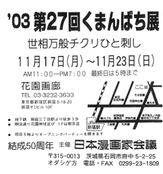 世相万般チクリひと刺し・・・・日本漫画家会議の「くまんばち展」。稲田年男さんに教えていただいて鑑賞にでかけました。むかし機関紙協会の機関紙大学で何回かご一緒に講師をつとめさせていただいた西山進先生の力作にであったり、かつて「生協運動」誌で馴染んだ馬場辰夫先生にお茶の接待をしていただき近作のコピーをいただいたり、おまけに今年が漫画家会議50周年(下が記念誌の表紙)と知ったり、感激もひとしおでありました。 |