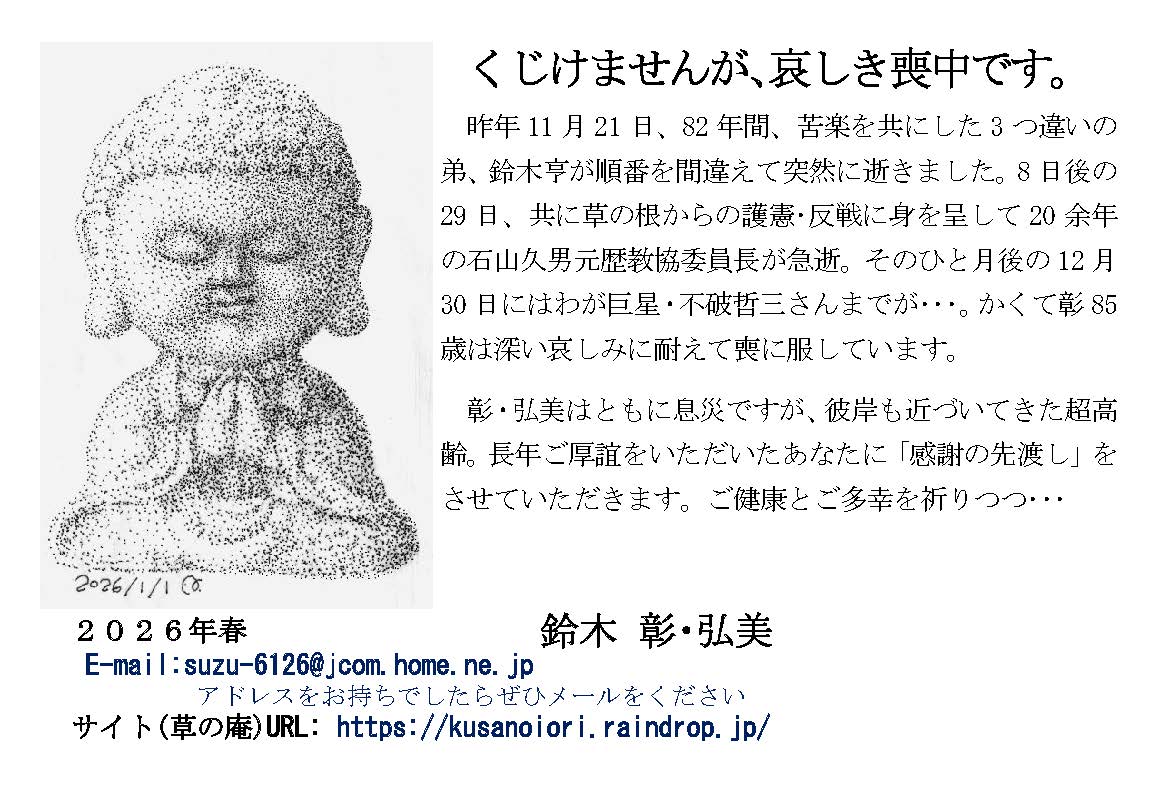 かけがえのないいのちと緑の地球を守り、人類の歴史を未来に繋いでいくのかどうかという重く厳しい問いかけを高く掲げて、いまこそ人間の歴史を拓くたたかいを、みんなのちからで繰り広げたいと、新たな気持ちで念願しています。これまでにましてお世話になると思いますが、よろしくお願いします。